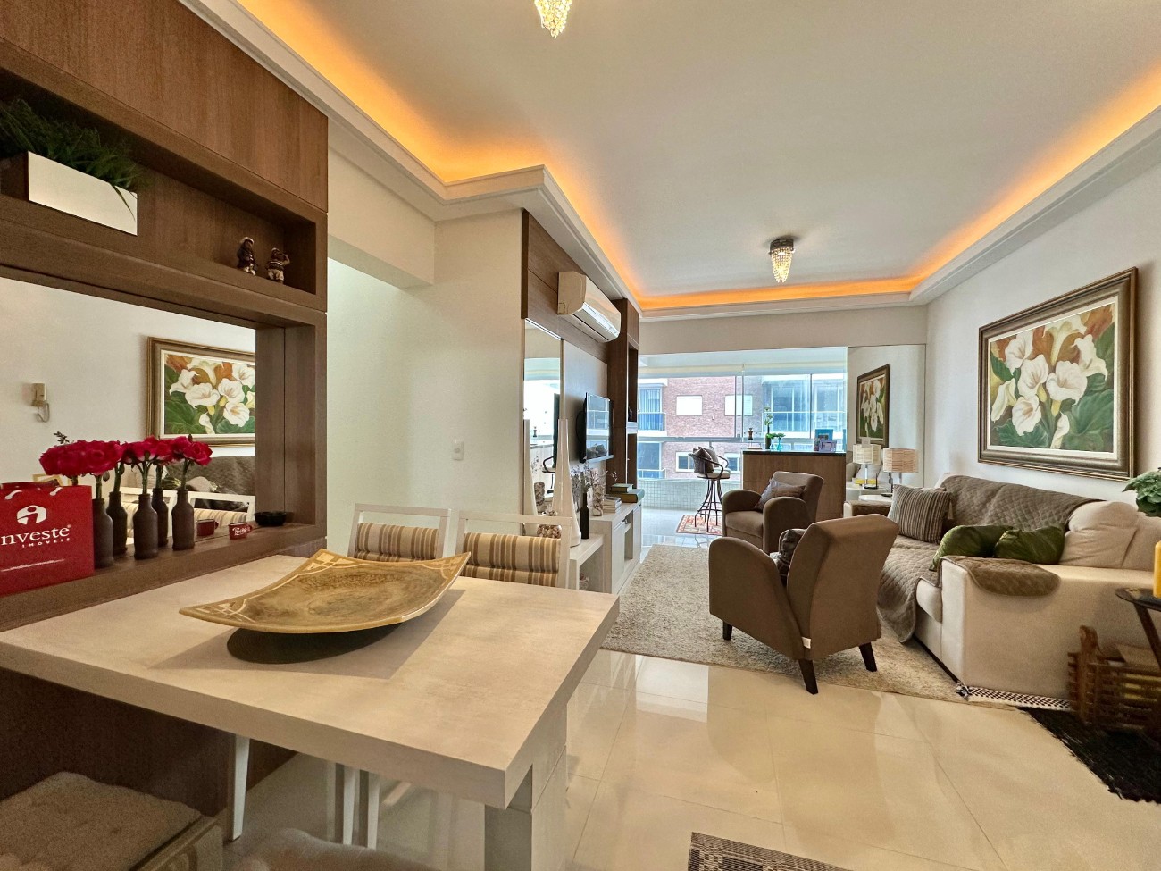 Com 121,43 metros quadrados de área total, o apartamento possui dois dormitórios, sendo uma suíte, além de banho social, área de serviço separada, living integrado e uma sacada de frente que proporciona uma vista ampla e agradável. Está completamente mobiliado e decorado, pronto para uso imediato, ideal tanto para moradia quanto para veraneio.