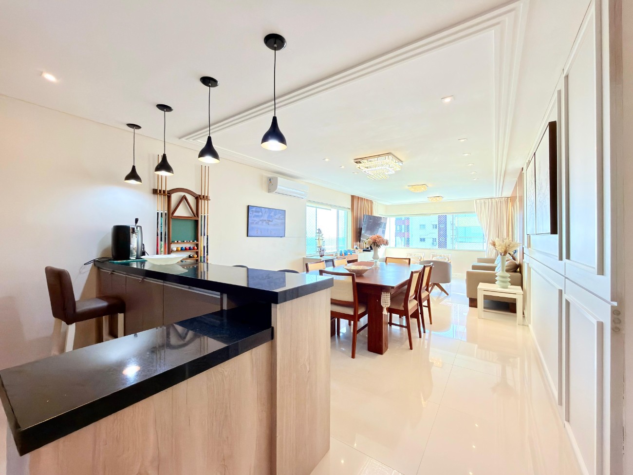 MELHOR QUE BEIRA MAR - Edifício de alto padrão construtivo, 100% revestido, água quente e gás central, hidrômetros individuais de água, infraestrutura completa com salão de festas, sala de jogos, sala de cinema, hall de entrada decorado com 2 elevadores, amplo 4 dormitórios, sendo 2 suítes, uma máster com hidromassagem, banheiro social e lavabo, amplo living em até 4 ambientes, sacada de frente com vista eterna para o mar e praça, todas as peças com porcelanato, espera para Split e rebaixe em gesso, 2 vagas de garagem.