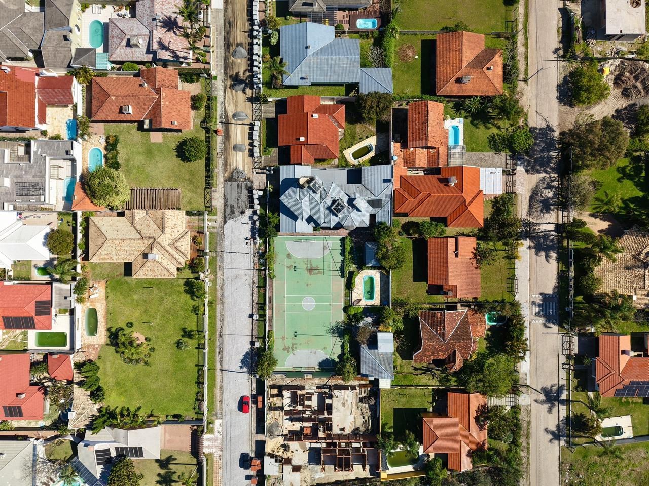 O espaço externo é um dos grandes diferenciais, com piscina, área gourmet, quadra de futsal, paisagismo que conecta os três terrenos e garagem coberta para seis veículos.