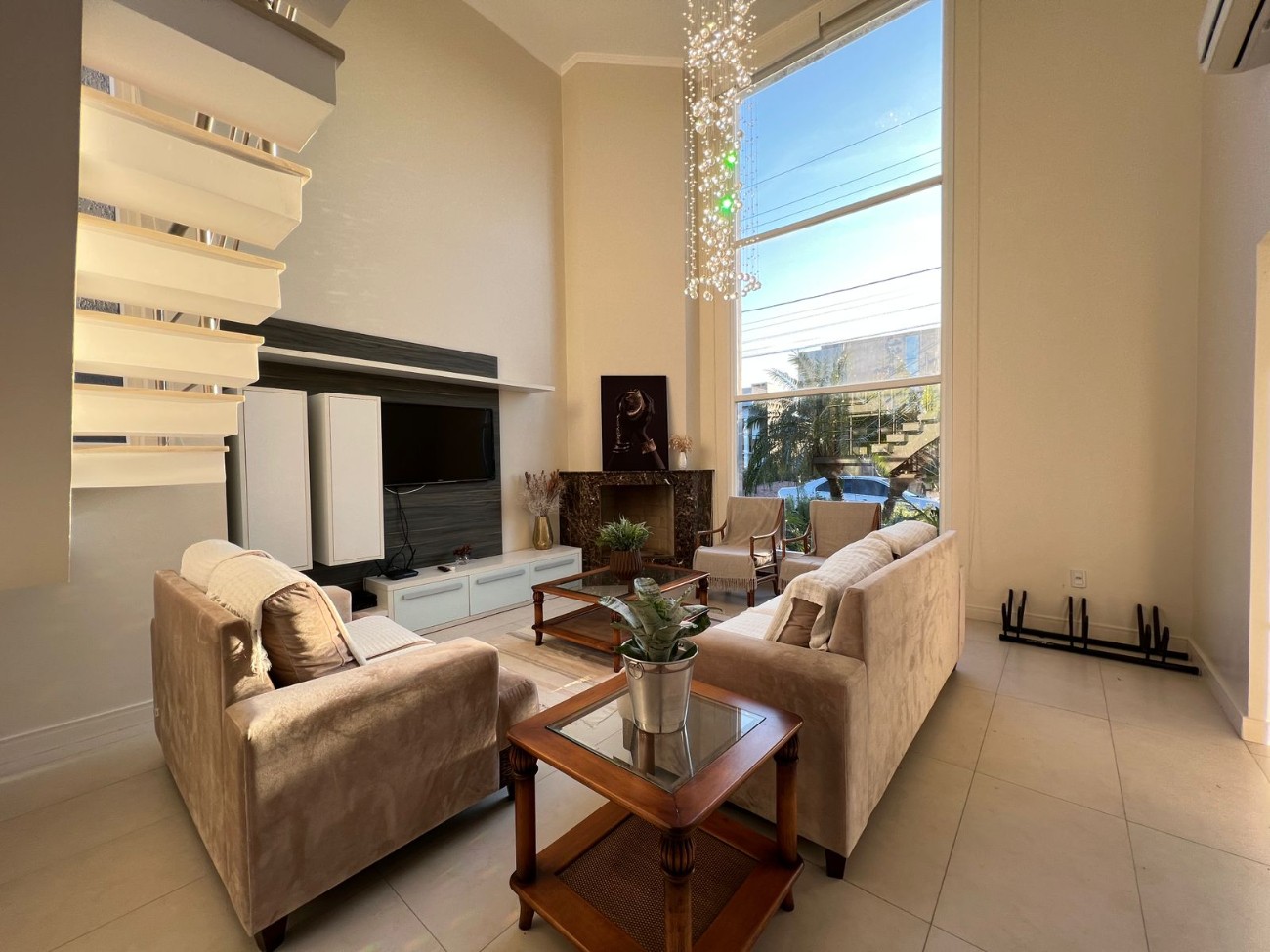 Térreo: Um dos dormitórios, sala de estar e jantar, lareira, lavabo, cozinha americana com dois ambientes. Espaço Gourmet com Churrasqueira. Banheiro Social, área de Serviço.