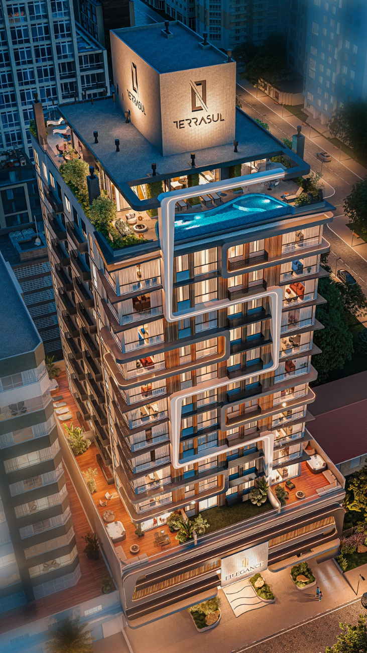 ELLEGANCE TERRASUL - UNIDADES 2, 3 E 4 dormitórios! Edificio residencial com 66 apartamentos exclusivos, hall de entrada finamente mobiliado & decorado, 3 andares de garagens, 2 elevadores de ultima geração, apartamentos com espaços garden, guarita de segurança 24hrs, depósitos, bicicletario, rooftop 360º com vista Mar e Serra, academia, espaço fitnes externo, cinema, fireplace, salao de festas gourmet, espaço kids, playground e garagens para todos os apartmentos com espera para carregador eletrico! Um local perfeito para morar, trabalhar e viver, combinando tudo o que é indispensável. Condição de pagamento: 20% de entrada e saldo em até 72x direto com a construtora apenas corrigido por INCC-M. Avalia dação como parte de pagamento. Entrega em Dezembro de 2027.