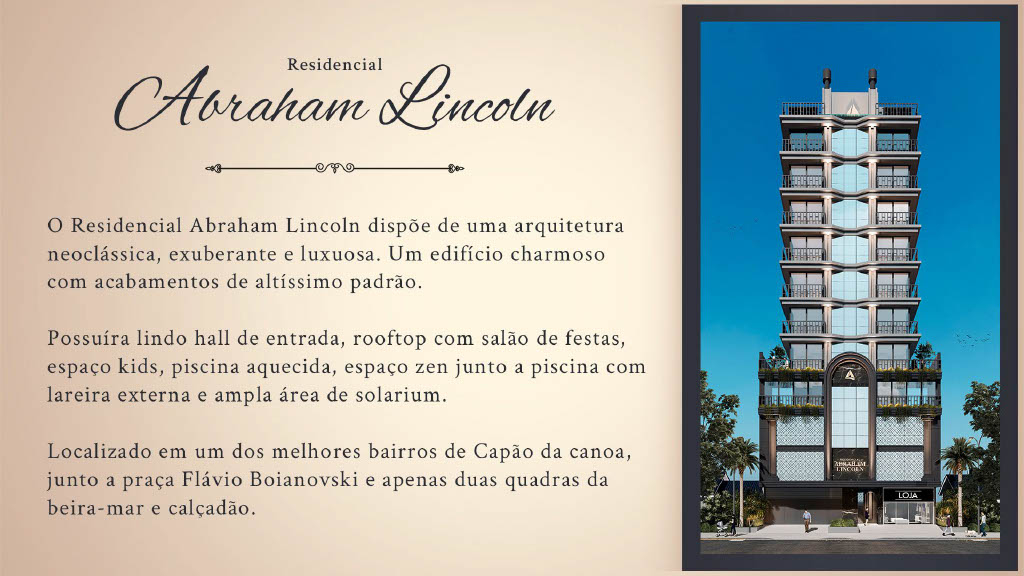 Residencial Abraham Lincoln em Capão da Canoa, empreendimento neoclássico de alto padrão no Centro, a duas quadras do mar, desenvolvido pela construtora Pirâmide
