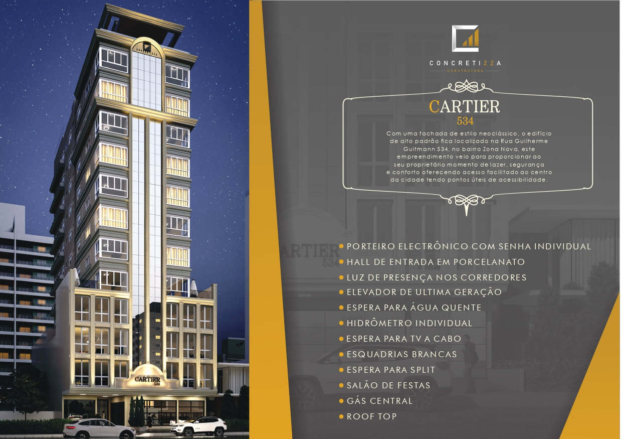 O Cartier é um empreendimento pronto em Capão da Canoa que se destaca pela arquitetura neoclássica, elegância nos detalhes e localização estratégica no bairro Zona Nova, na Rua Guilherme Guitmann, próximo ao centro da cidade e com fácil acesso ao mar e às principais conveniências. Ideal para quem busca apartamento em Capão da Canoa pronto para uso, com conforto, segurança e valorização.