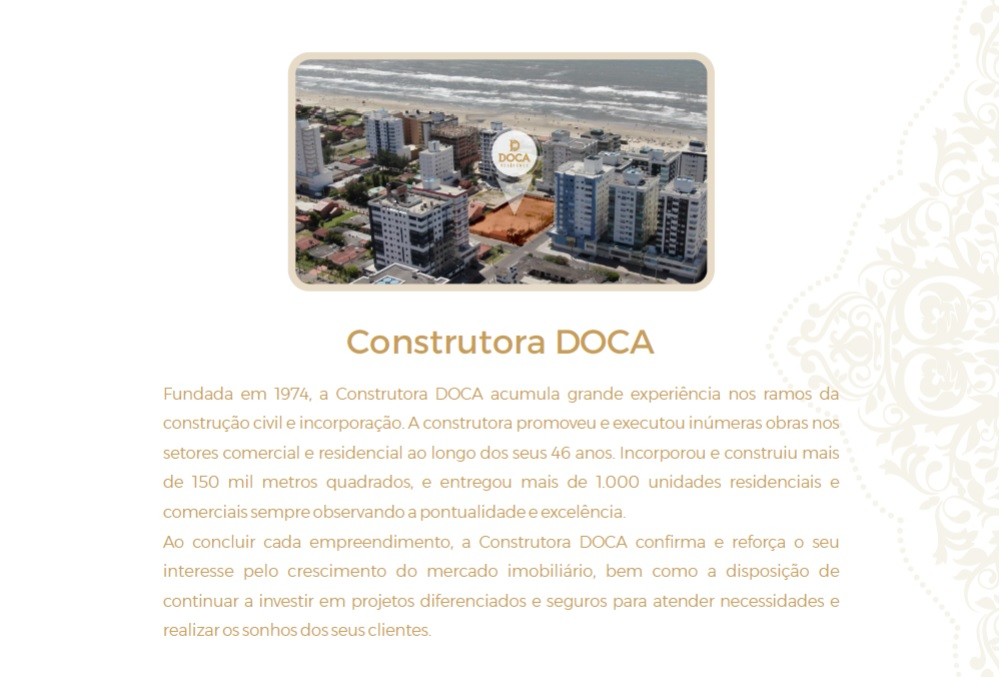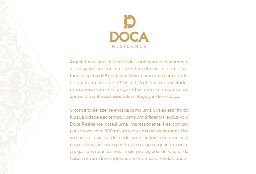 Doca Residence o mais novo empreendimento luxuoso de Capão da Canoa, com duas torres, com estilo da arquitetura neoclássica, a meia quadra do mar, no bairro Zona Nova, prédio com uma infraestrutura que irá lhe surpreender a sua família, com rooftop com piscina, duas academias, dois salões de festas, espaço zen e 4 elevadores. Apartamentos de 1, 2 e 3 dormitórios com suíte, amplos e com fino acabamento. Conheça.