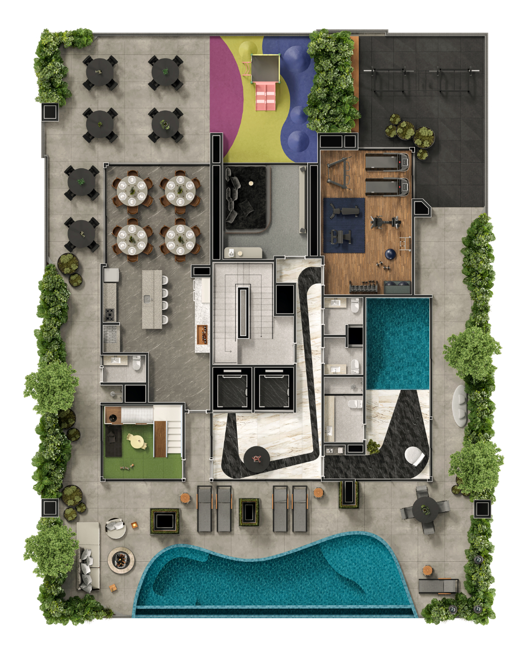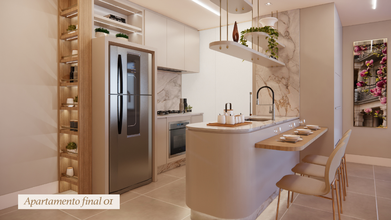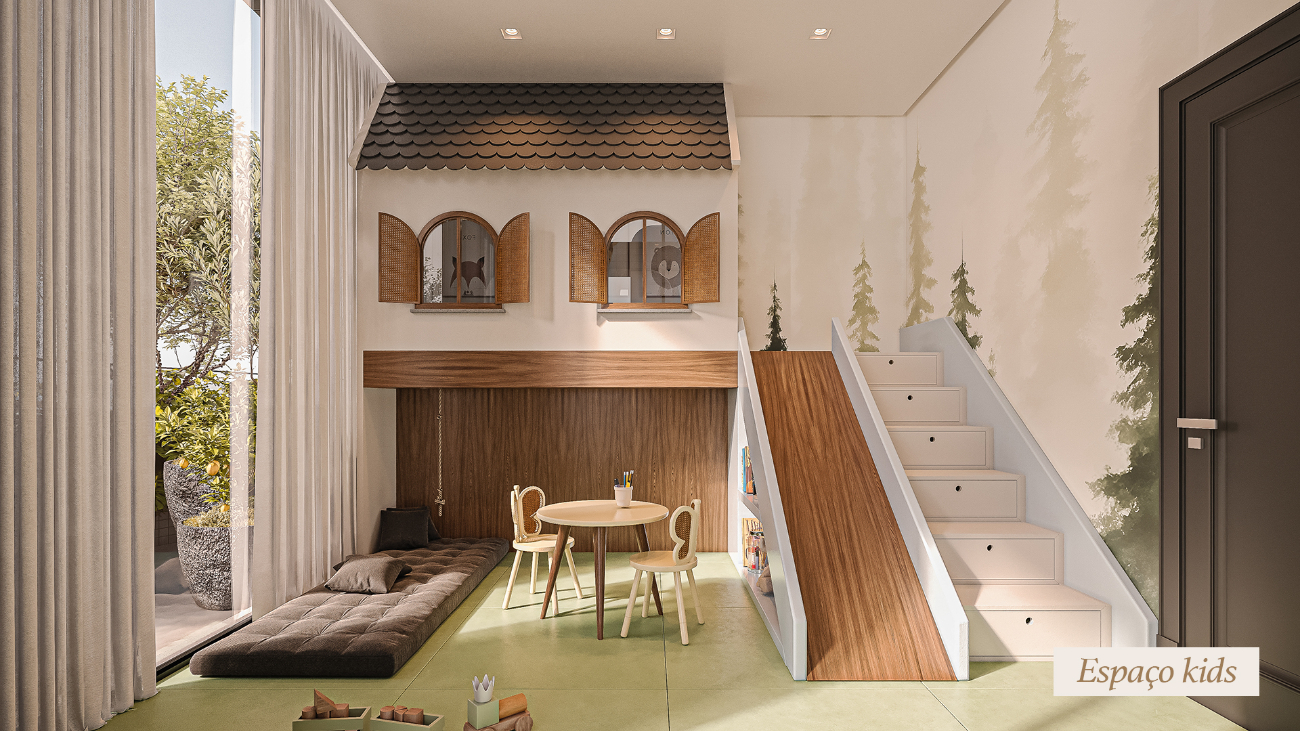 O espaço conta com academia, fitness externo, cinema, fireplace, salão de festas gourmet, espaço kids e playground, criando um ambiente ideal para convivência e bem-estar.