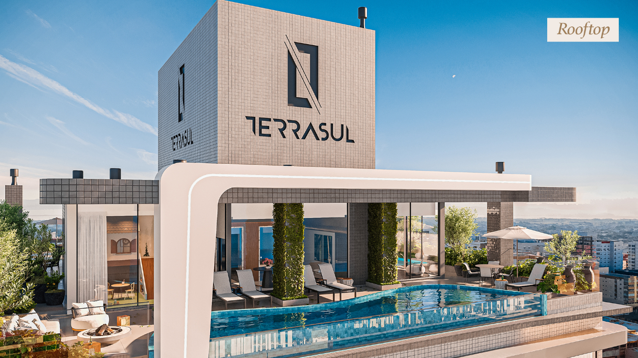 O grande diferencial do Ellegance Terrasul em Capão da Canoa RS é o rooftop 360 graus, com vista para o mar e para a serra, reunindo uma infraestrutura completa de lazer.