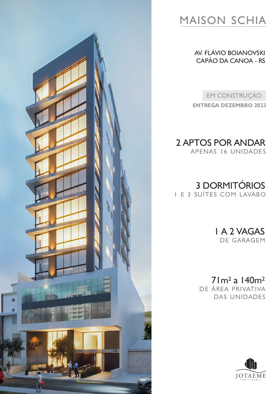 Maison Schia esta localizado na Avenida Flávio Boianovski capão da canoa – RS, em construção entrega dezembro 2023 apenas 16 unidades 2 aptos por andar 1 e 3 suítes com lavabo 3 dormitórios de garagem 1 a 2 vagas de área privativa das unidades 71m² a 140m², sistema de reaproveitamento de água da chuva para áreas comuns, sistema de energia solar para áreas comuns, porteiro eletrônico, hall de entrada decorado, esquadrias em pvc, elevador de última geração, áreas de lazer mobiliada de decorada, infraestrutura para medidores individuais de água, luz e gás zelador permanente, revestimento externo em pastilha, infraestrutura para ar split, piscina aquecida com prainha, salão de festas mobiliado e decorado pergolado área externa comum com vista 360º.