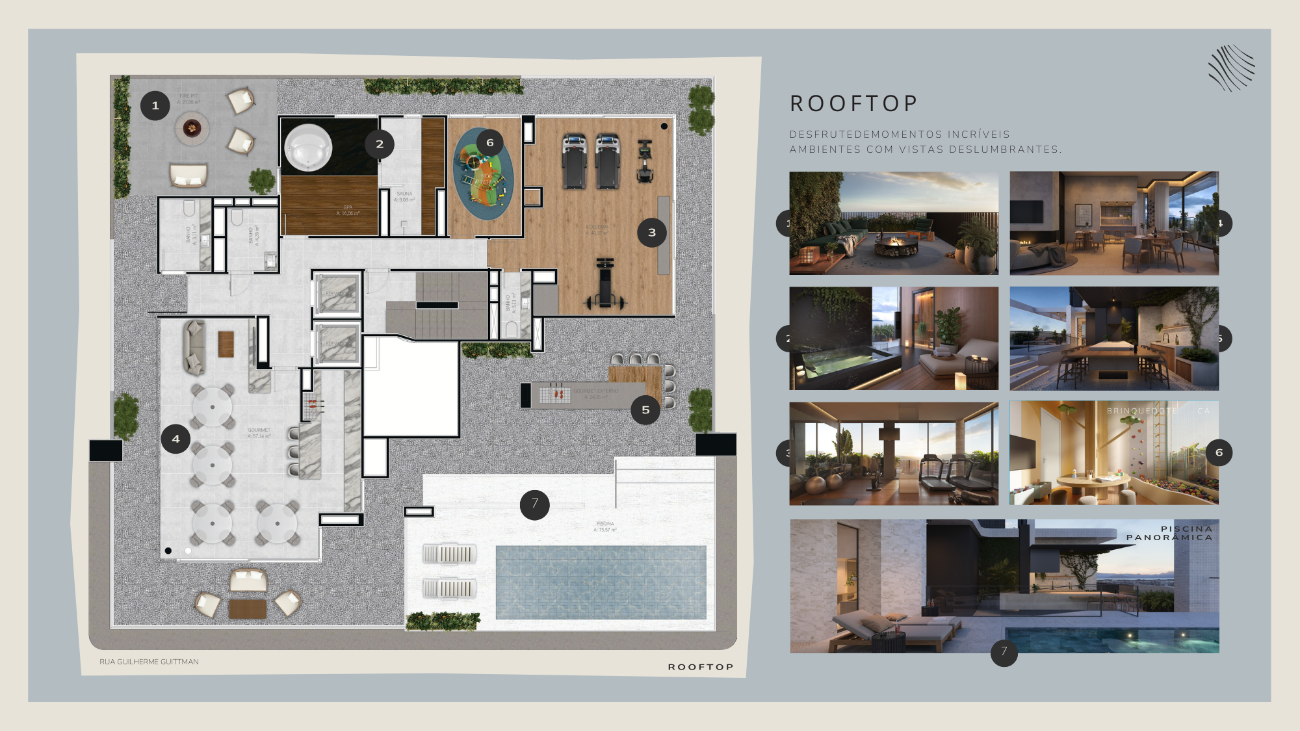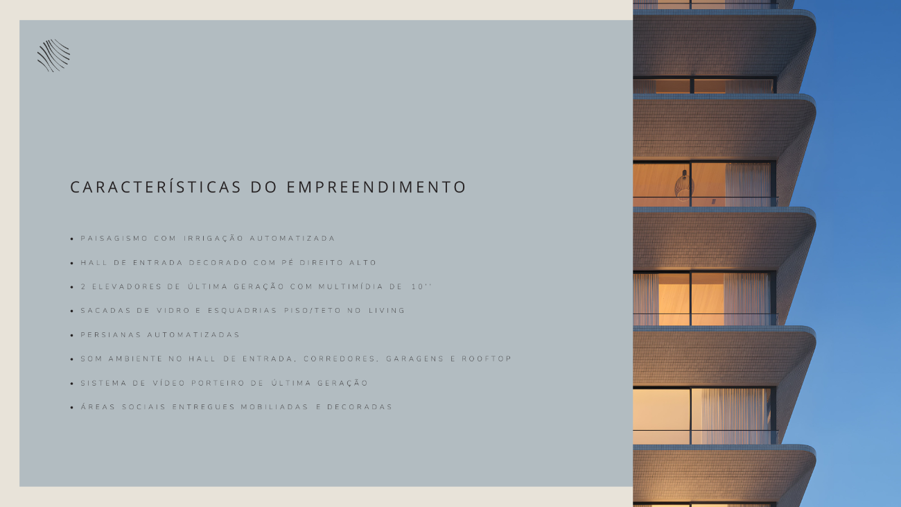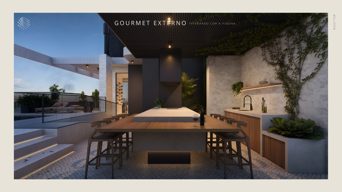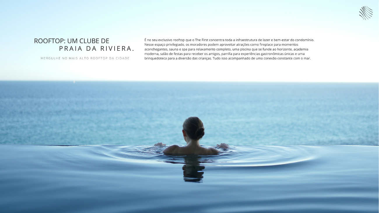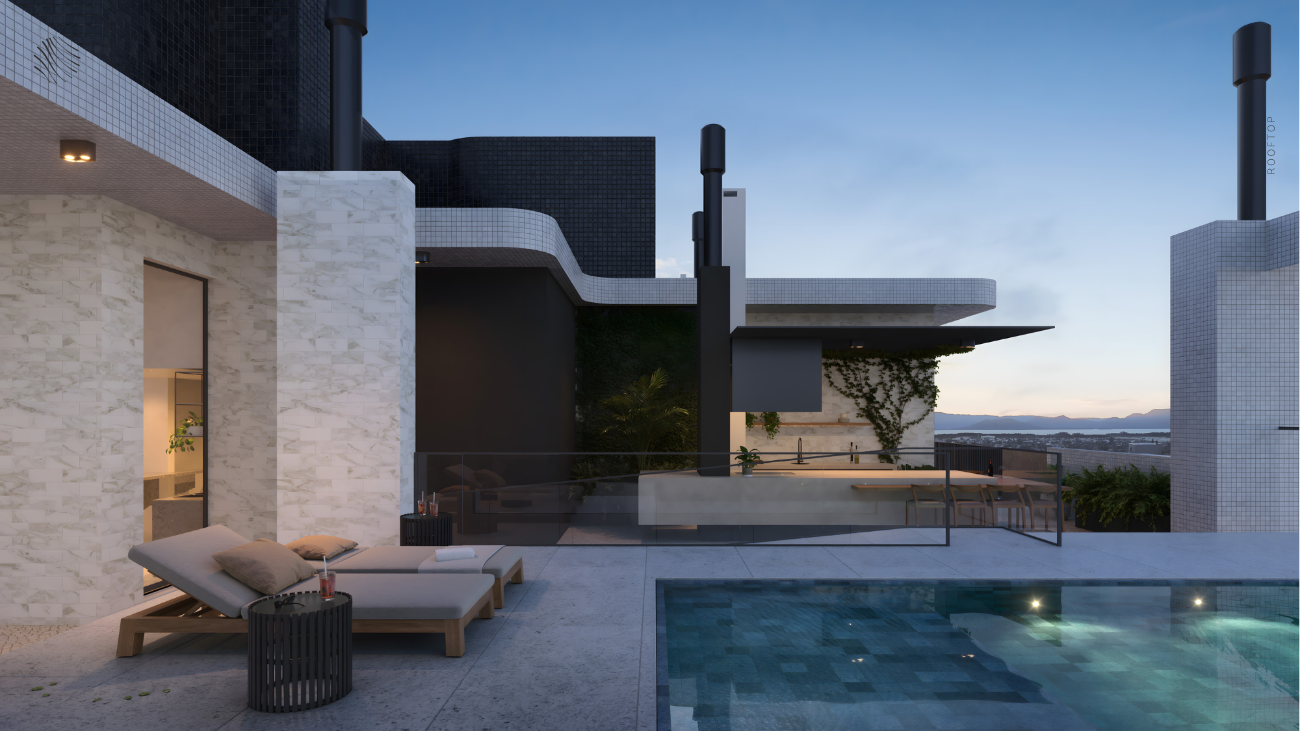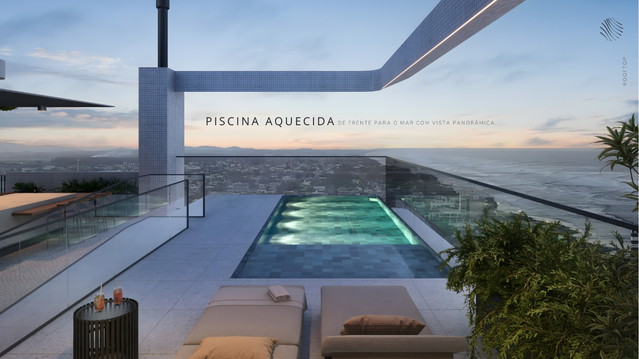 A arquitetura segue linhas minimalistas inspiradas na costa azul, com volumetria imponente, proporções precisas e acabamentos que revelam a intenção de criar algo atemporal. No topo, o rooftop reúne piscina de borda infinita, spa, sauna, fitness, salão de festas, parrilla e brinquedoteca, todos posicionados para aproveitar a vista panorâmica do mar e da cidade.