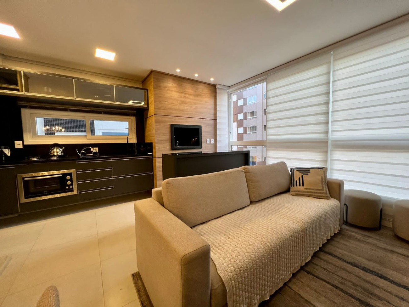 Apartamento finamente mobiliado e decorado, composto de 2 dormitórios, sendo uma suíte, banheiro social, living em 2 ambientes, churrasqueira, cozinha americana, área de serviço. 100% rebaixo em gesso, piso porcelanato, espera para split, espera para água quente, gás central, hidrômetro individual, janelas em pvc, antena de tv coletiva e a cabo. Edifício de alto padrão, infraestrutura de lazer completa, piscina aquecida, salão de festas mobiliado, brinquedoteca, academia equipada, deck interno e externo.