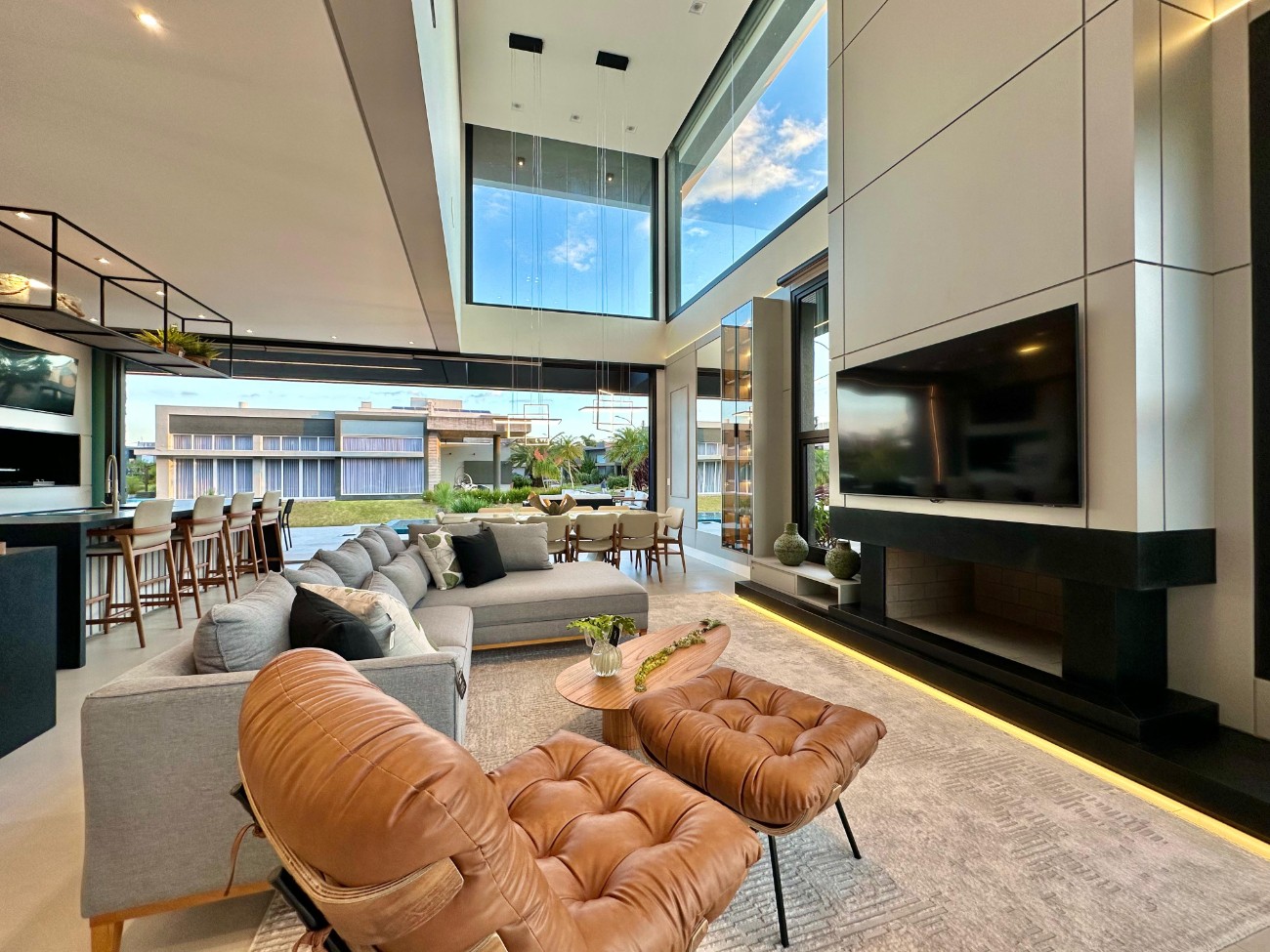 **Sobrado à Venda no Condomínio Malibu, Beira Lago** Apresentamos uma oportunidade única de adquirir um sobrado luxuoso localizado no renomado Condomínio Malibu, com uma impressionante vista para o lago. Este magnífico sobrado possui uma área construída de 320, 23m² em um lote de 450, 89m², oferecendo espaço e conforto incomparáveis. Totalmente mobiliado e decorado, este imóvel é composto por cinco suítes, sendo uma delas uma suíte térrea com acessibilidade, ideal para atender às necessidades de toda a família. A suíte master é um destaque à parte, com espaço generoso para um closet e uma banheira, proporcionando um ambiente de relaxamento e privacidade. O sobrado também dispõe de um home office, perfeito para aqueles que trabalham remotamente ou precisam de um espaço tranquilo para estudos. O living integrado de 66, 00m² com pé direito duplo cria um ambiente amplo e arejado, ideal para receber amigos e familiares. A cozinha gourmet é equipada com churrasqueira, tornando as refeições um momento especial. Para maior conveniência, há um lavabo social, além de uma lavanderia e dois depósitos independentes. O lounge externo, com 105, 85m², oferece um espaço privilegiado para desfrutar da vista do lago, acompanhado de um lavabo exclusivo para essa área. A área de lazer inclui uma piscina de 18, 75m² com borda infinita e estar seco, além de um deck de madeira de lei, proporcionando um ambiente elegante e relaxante. O abrigo para dois carros garante segurança e comodidade. O jardim é um espetáculo à parte, com sistema de irrigação e iluminação, complementando a beleza do imóvel. As esquadrias em PVC preto adicionam um toque de modernidade e sofisticação ao projeto. Este sobrado no Condomínio Malibu é a escolha perfeita para quem busca luxo, conforto e uma localização privilegiada. Não perca a oportunidade de viver em um verdadeiro paraíso à beira do lago.